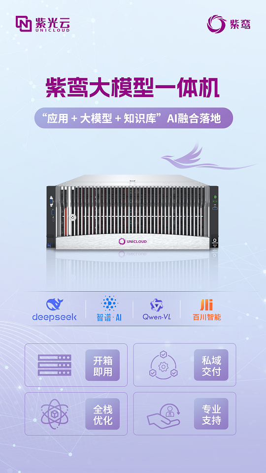 紫光云紫鸾大模型一体机支持全离线环境部署DeepSeek,企业无需依赖公有云,避免数据泄露风险,满足金融,医疗,政府等行业的合规与安全要求,同时,无需担心API稳定性,Token限制,业务运行更顺畅 蜜桃视频蜜桃APP,结合RAG(检索增强生成)能力,紫鸾大模型一体机赋能用户更好地管理和利用自有数据,提供基于私域数据资产的AI加速,实现数据安全与模型能力的全面兼顾,助力关键行业实现智能化跃迁, 。